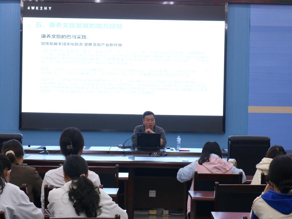 覃举东为张德欣颁发客座教授聘书,并表示热烈欢迎。张德欣就文旅融合发展的时代背景、从老年旅游到长寿旅游、康养文旅发展趋势与创新、康养文旅发展的地方经验等给同学们展开解说,在讲到康养文旅发展趋势与创新时着重讲到了康养元宇宙,并提出了康养文旅存在的问题,也给出了创新路径,除此之外,将自己总结的成功4力分享给同学们,这4力分别是资源把握力、产品策划力、网络运营力、服务执行力,指出成功4力最关键的服务执行力。以海南、攀枝花市还有广西河池巴马等康养文旅地方经验为案例,提出了康养文旅实践的可行路径。