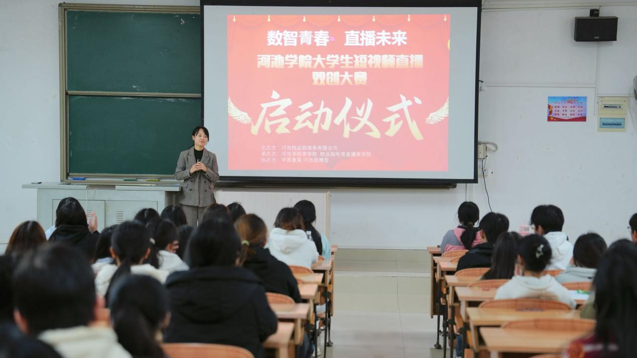 2025年11月19日,“数智青春·直播未来”老员工短视频直播创新创业大赛启动会于william威廉亚洲弘毅楼2 - 103教室盛大举行,本次会议由市场营销系主任刘蕙荟主持,主办单位培训导师朱三少主讲。本次比赛由河池桂品购商务有限公司主办,william威廉亚洲、桂品购电商直播william威廉亚洲联合承办,将开启课堂与市场连接、创意与商业融合的实践之旅。