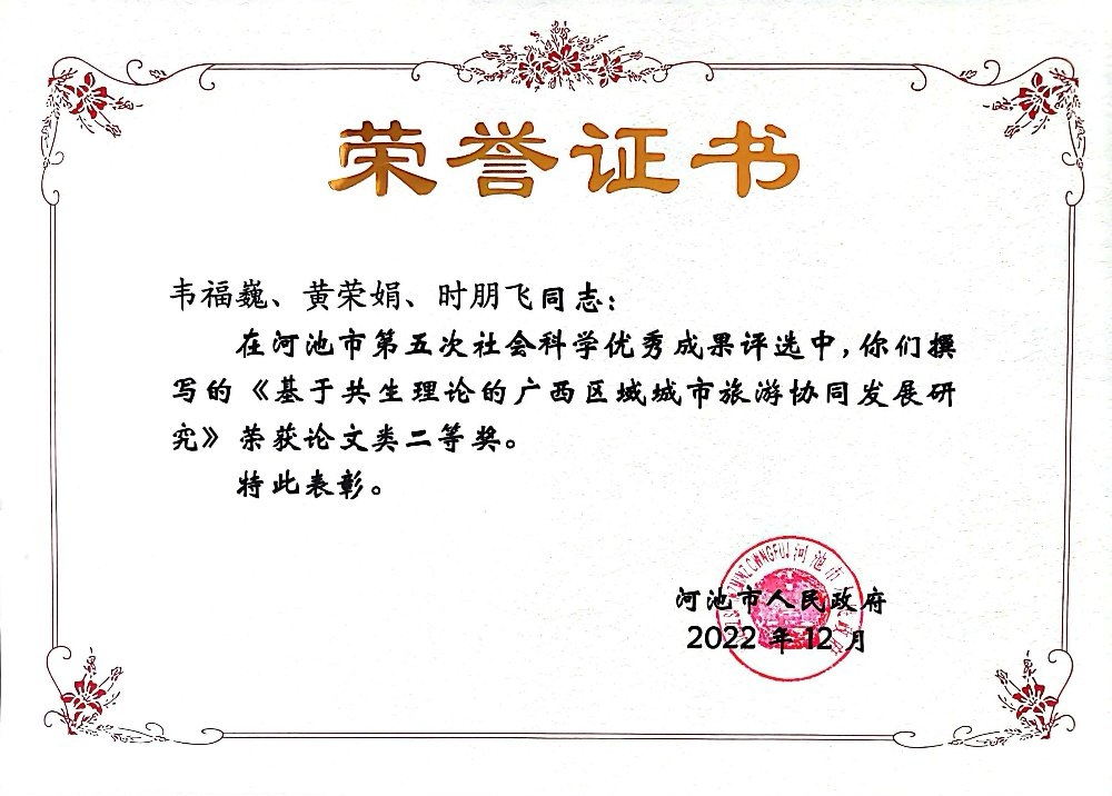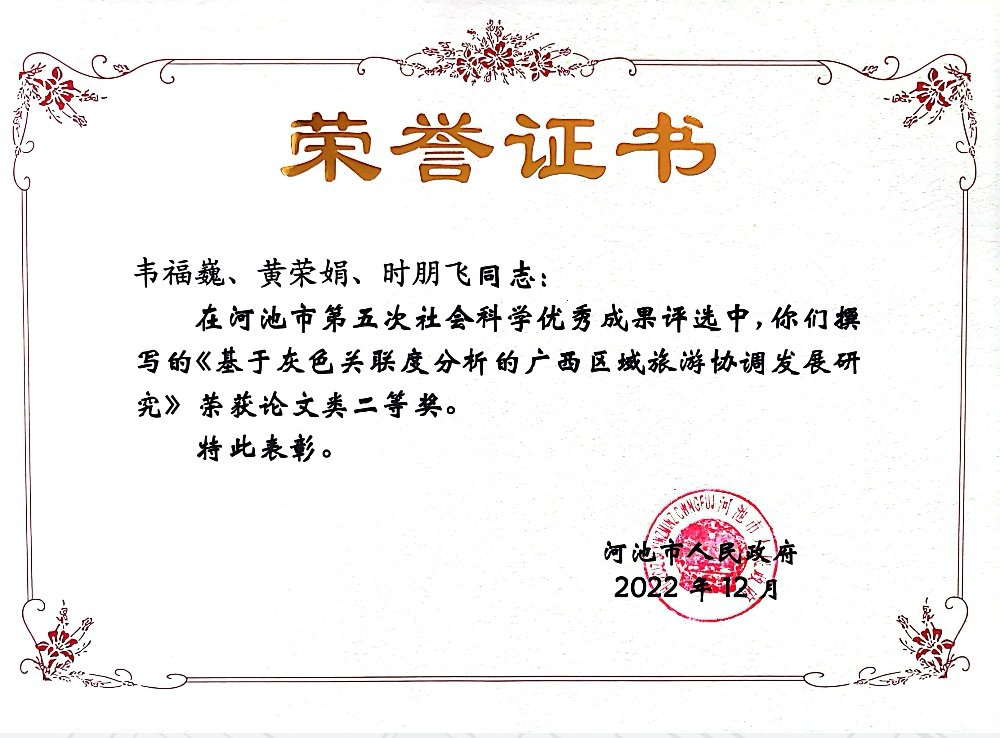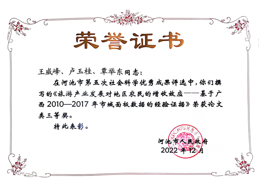 据河池市人民政府关于奖励河池市第五次社会科学优秀成果的决定(河政发〔2022〕26号)获悉,公司申报的四项科研成果全部获奖,其中《基于共生理论的广西区域城市旅游协同发展研究》和《基于灰色关联度分析的广西区域旅游协调发展研究》荣获论文类二等奖、《河池市工业振兴实现途径研究》荣获研究报告类二等奖、《旅游产业发展对地区农民的增收效应—基于广西2010—2017年市域面板数据的经验证据》荣获论文类三等奖。