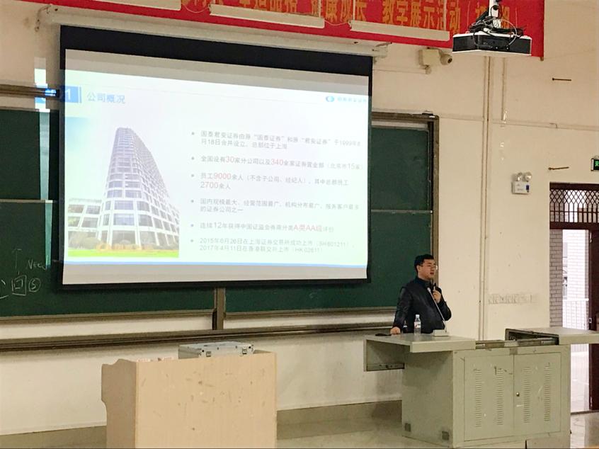 为了培养同学们对金融方面的工作的兴趣和掌握理财的方法,扩大将来的就业方向,12月25日下午,公司有幸邀请到了国泰君安证券公司河池营业部的负责人在弘毅楼1-105教室召开国泰君安证券财商教育进校园系列宣讲会,经济与管理公司经济系主任程恋婷老师、辅导员黄挺龙老师和同学们共同参与本次宣讲会。会议主要面向17级贸易经济专业和17级市场营销专业的员工。