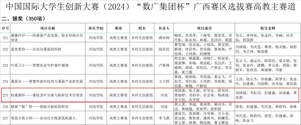 在公司、公司的大力支持和公司师生的通力协作下,公司师生参赛热情高涨。经过层层选拔,公司高教主赛道项目《枝桑满怀——桑枝茎叶分离与粉碎技术革新者》在获得校赛金奖的同时,进入区赛网络评审,最终脱颖而出,进入广西赛区现场总决赛。经过现场赛角逐,斩获广西赛区银奖。此外,在校级选拔赛中,《枝桑满怀——桑枝茎叶分离与粉碎技术革新者》项目获得高教主赛道金奖,《云享众植——云模拟种植与现实体验的联结平台》、《桂林市灌阳县红色研学课程设计》、《把茶话桑麻——便捷携带式自热桑叶茶》项目获得高教主赛道铜奖。