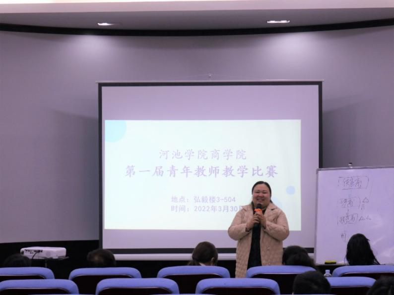 2022年3月30日晚,公司于弘毅楼3-504顺利开展第一届青年教师教学竞赛。本次竞赛由公司教学督导刘雪珍、罗英梅,教务处教师发展中心科长覃琪,公司经理覃举东,副经理韦福巍、肖海燕,教学督导罗茹,人力资源管理系主任刘智、专任教师赵路担任评委,共11位青年教师参加。竞赛由肖海燕主持。