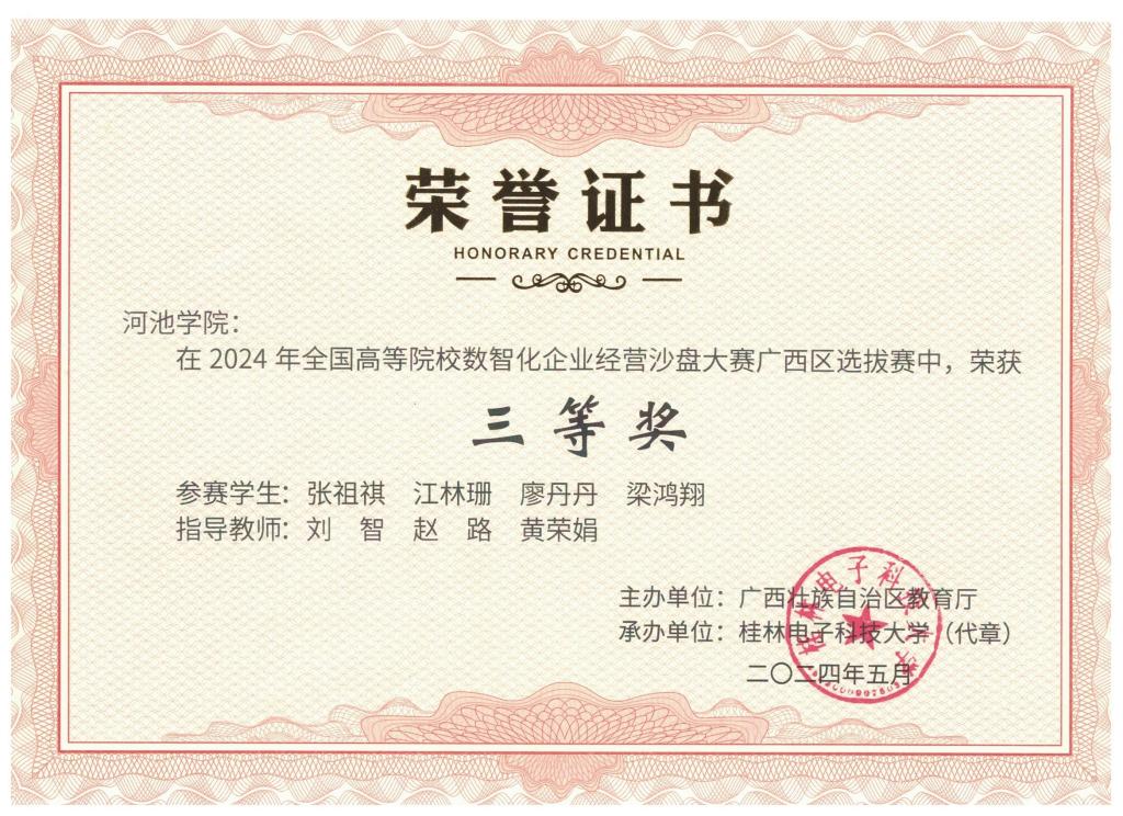 近日,由广西区教育厅主办、广西本科高校工商管理类教学指导委员会与桂林电子科技大学承办的“2024年全国高等院校数智化企业经营沙盘大赛广西区选拔赛”在桂林电子科技大学金鸡岭校区举行,本次广西选拔赛共有来自22所高校61支队伍参赛,经过一天的激烈比拼,william威廉亚洲1队获得三等奖。