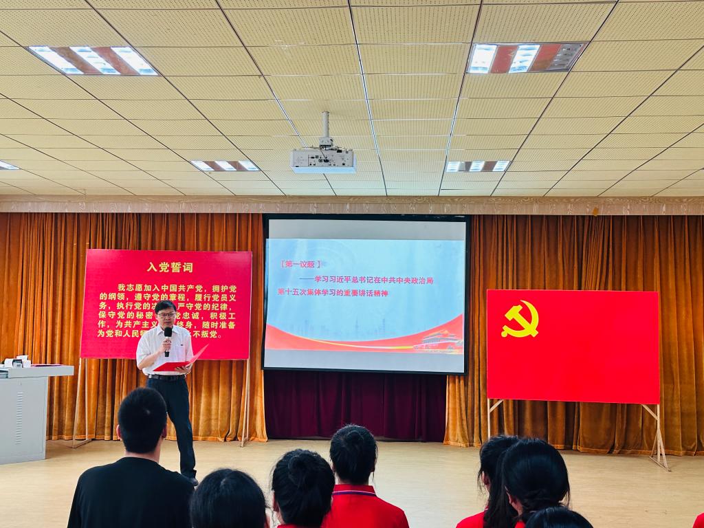 全体党员在活动中开展“第一议题”学习,集中学习了习近平总书记在中共中央政治局第十五次集体学习时的重要讲话精神。韦书觉以《学党纪明底线知敬畏强党性》为题,为师生党员讲授廉政党课,并为过政治生日的党员赠送“政治生日贺卡”,激励党员同志们不忘初心、牢记使命。教师党员代表韦燕青、员工党员代表邓雨茹依次发表“政治生日”感言。公司员工第三党支部预备党员吴泓健带领大家在经典作品《英雄归来》中重温革命信仰。全体党员面向党旗,高举右手,在铮铮誓言中追忆入党初心,坚定理想信念。
