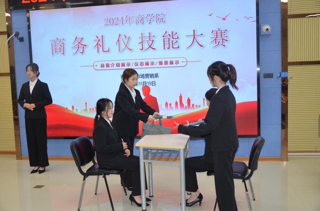 大赛依托《商务谈判与礼仪》课程,分为三个环节:自我介绍环节、礼仪展示环节和情景展示环节。自我介绍环节中,选手们以简洁明了、幽默风趣、诚恳的语言展示个人风采;礼仪展示环节,选手们通过仪容仪表,站姿、坐姿、行姿和蹲姿的展示,凸显商务人员的专业形象;情景展示环节,各团队模拟商务场景,涉及问候礼仪、介绍礼仪、握手礼仪、交换名片礼仪和签订合同礼仪等。比赛现场气氛紧张而活跃,专业而不失趣味,最后,刘蕙荟对本次大赛进行了点评。