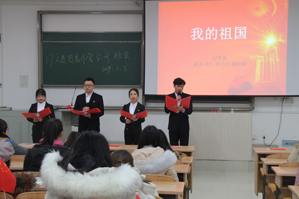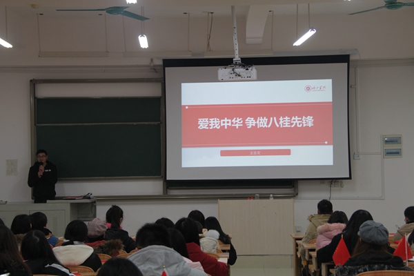 在改革开放40周年之际,为了增强同学们对国家和广西发展状况的了解,弘扬社会主义核心价值观,增强凝聚力和爱国主义情怀,1月3日晚,2017级人力资源管理、2017级贸易经济、2017级市场营销专业在弘毅楼2-503教室召开“爱我中华,争做八桂先锋”主题班会。本次班会由王忠文主持,三个专业的同学积极参与到此次班会。