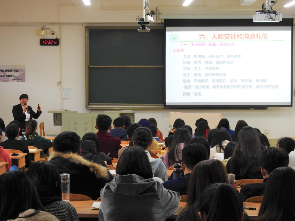 3月17日下午,经管公司2018-2019学年第三期青马工程第三课——员工干部素质与礼仪培训于弘毅楼2-205教室开展。公司党委副书记蓝色老师为同学开展主题为“提升人际交往与沟通技巧,塑造魅力四射形象”的讲座。公司团委、员工会全体干部、各班级的班长、团支书、学习委员、纪律委员参加学习。