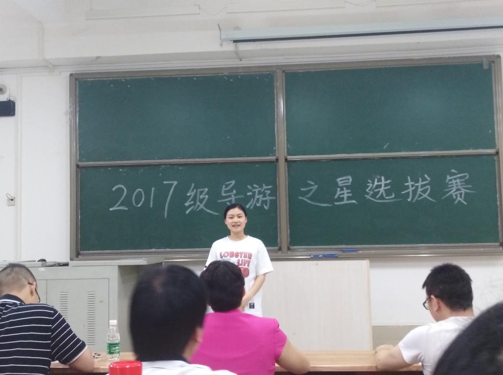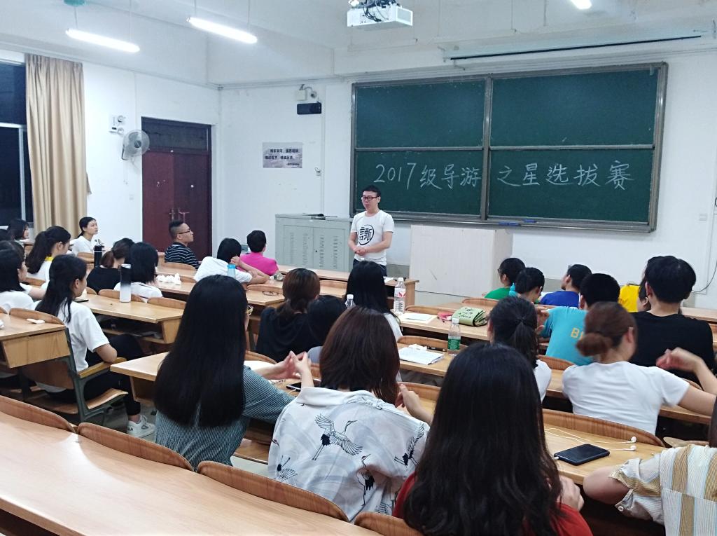 为强化旅游管理专业员工职业素质,集中展示员工的礼仪风采、景点讲解技能及才艺表演技能,经济与管理公司近期举办了第六届华昱杯“导游之星”大赛活动。4月25日晚上,17旅游管理在弘毅楼2-202举行了“导游之星”选拔赛,到场的评委老师有经管公司副经理韦福巍、旅游管理系主任杨辉强、旅游管理系专业老师温庆林、王强以及班主任蓝色,全班同学参加了比赛。