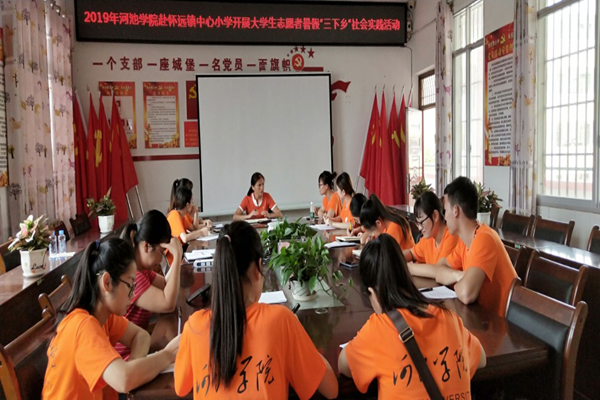 团队成员在前期做了大量准备工作的前提下,本次“三下乡”实践活动于2019年7月14日上午八点半正式启动。小组成员分成两组,主要用调查问卷法、实地走访、实地考察与面谈法等形式深入宜州怀远镇开展调研活动,分别从教育、医疗、扶贫产业等环节进行,以怀远镇小学相关负责人、群众、村委、卫生所、卫生扶贫基地等为对象,充分深刻了解怀远镇情况。同学们通过对宜州市怀远镇附近村乡村振兴发展状况进行考察分析和整合,并观察农民的生活环境及国家给他们的优惠政策。通过了解基础设施建设、医疗设施、教育、农业等方面等的改善变化,对怀远镇的乡村经济发展进行考察研究,探讨出更好的发展建议。