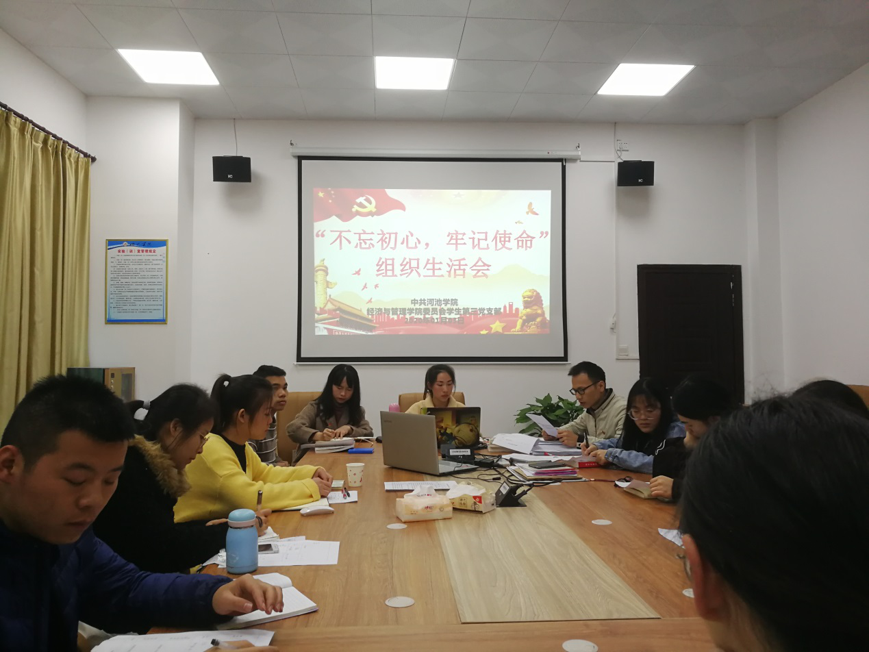 经济与管理公司员工第三党支部于2020年1月3日晚在弘毅楼2-208教室开展了以“不忘初心、牢记使命”为主题的组织生活会议和民主评议会议,本次会议由支部书记黄挺龙和27名党员同志参加。