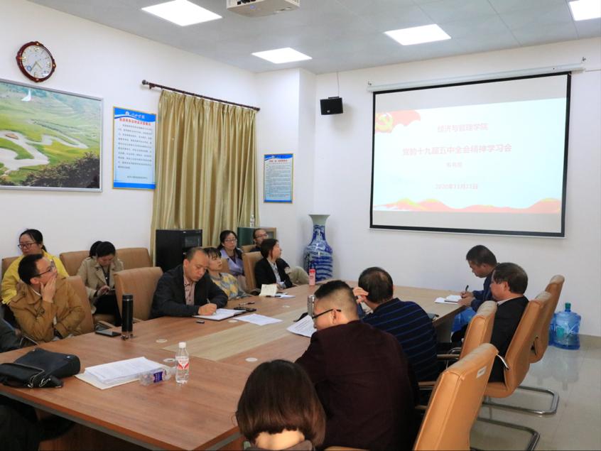 11月11日下午,经管公司于弘毅楼2-208会议室召开“学习贯彻党的十九届五中全会精神”专题学习会。公司党委书记韦书觉、经理覃举东、副经理谭玉龙和各系系主任及各班班主任出席会议。