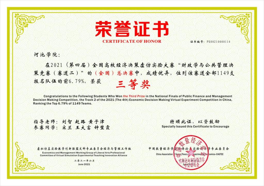 近日,第四届全国高校经济决策虚仿实验大赛“财政学与公共管理决策竞赛”落下帷幕。在公司专任教师刘智、赵路、黄子津指导带领下,18级人力资源管理专业宋兰、王大富、钟璧霞组成的代表队最终荣获全国总决赛三等奖。