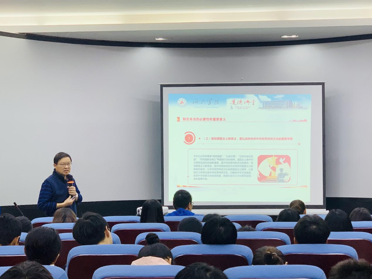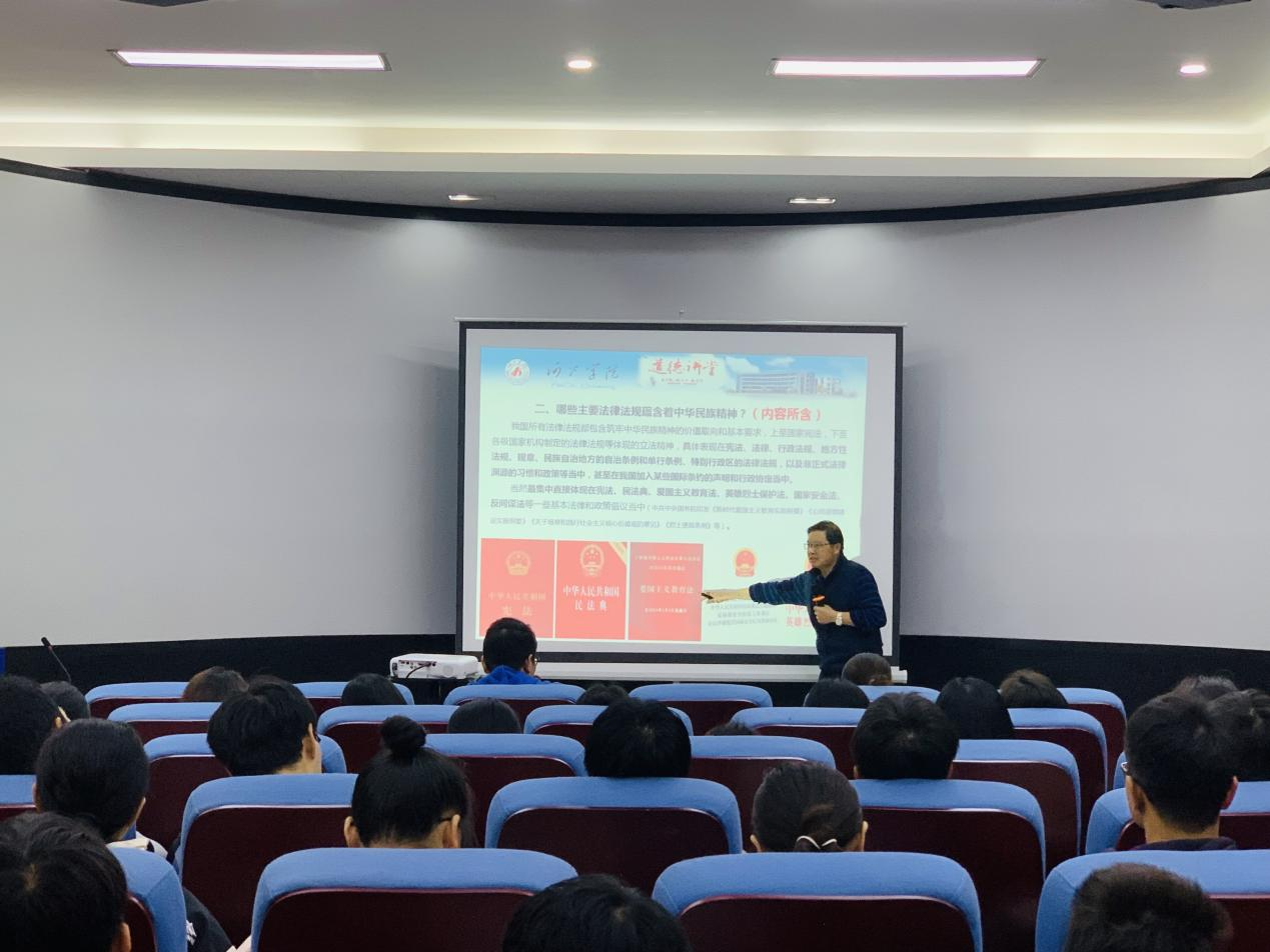 韦书觉以《弘扬法律精神厚植爱国情怀》为主题,围绕“我们为何要强化筑牢中华民族精神立法工作?哪些主要法律法规蕴含着中华民族精神?我们如何筑牢中华民族精神厚植爱国情怀?”等三方面内容展开,强调“国家安全是民族复兴的根基,社会稳定是国家强盛的前提。”希望同学们树立国家安全意识,保守国家秘密,不做有损国家安全之事。尤其是面对当今日益发达的网络世界,更要明辨是非,不受危害国家的思想蛊惑;谨言慎行,防止被不法之人利用。